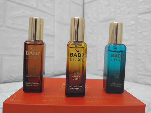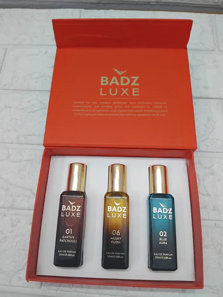- It consists of Badz Luxe 02 Blue Aura Eau De Perfume, Badz 06 Musky Oudh Eau De Perfume , Badz Luxe 01 Earthy Patchouli Eau De Perfume each for 20ml