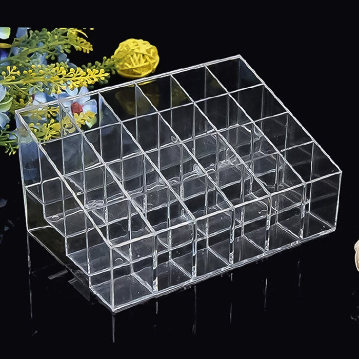 - Save your time and effort by keeping everything in one place with this great clear acrylic cosmetic stand. The top stand has been divided into 24 versatile compartments ideal for brushes, creams and lipsticks.