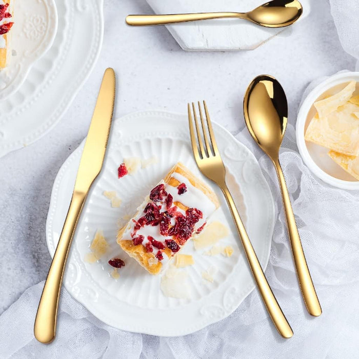 - 24 PCS PREMIUM CUTLERY SET - gold flatware set includes 6 dinner knives, 6 dinner forks, 6 dinner spoons, 6 tea/dessert spoons. Comes with a premium gift storage box.