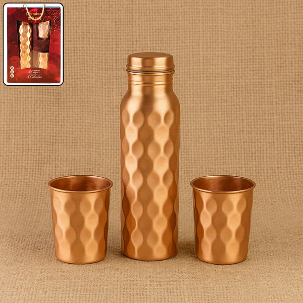 Diamond Cut Copper Water Bottle 2 Glasses with Gift Box (3 Pcs Set)