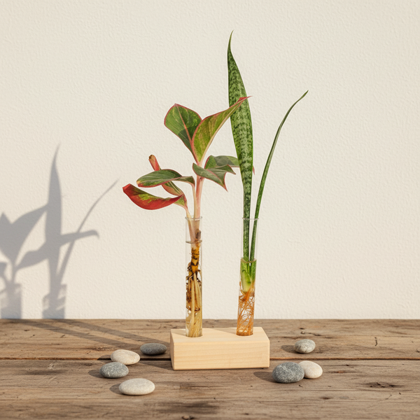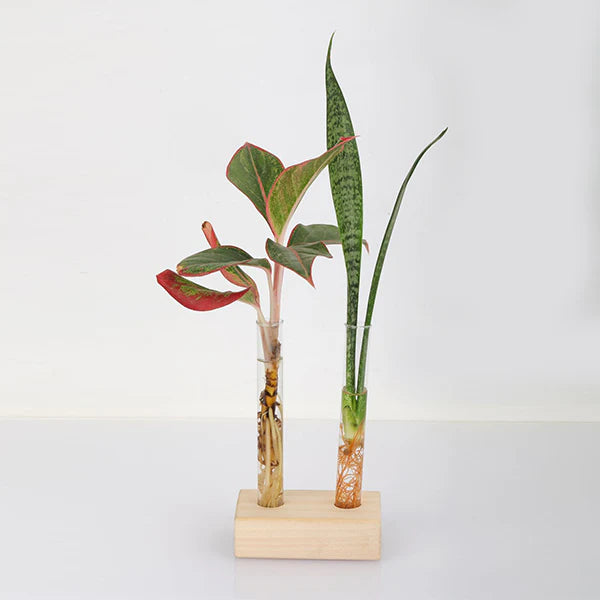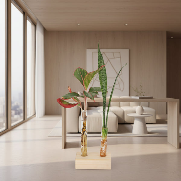 Elegant Minimal Design: Features sleek glass test tubes set on a smooth wooden base for a modern, natural aesthetic.