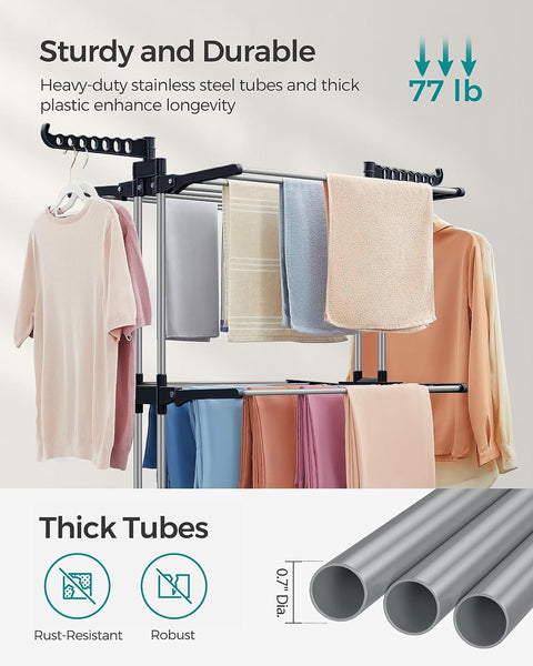 HEAVY-DUTY & FOLDABLE DESIGN – Built with thick stainless steel tubing and premium-grade plastic joints, this rack offers stability, reliability, and extended service life. Ideal for drying and organizing everything from kids' clothes to large blankets.