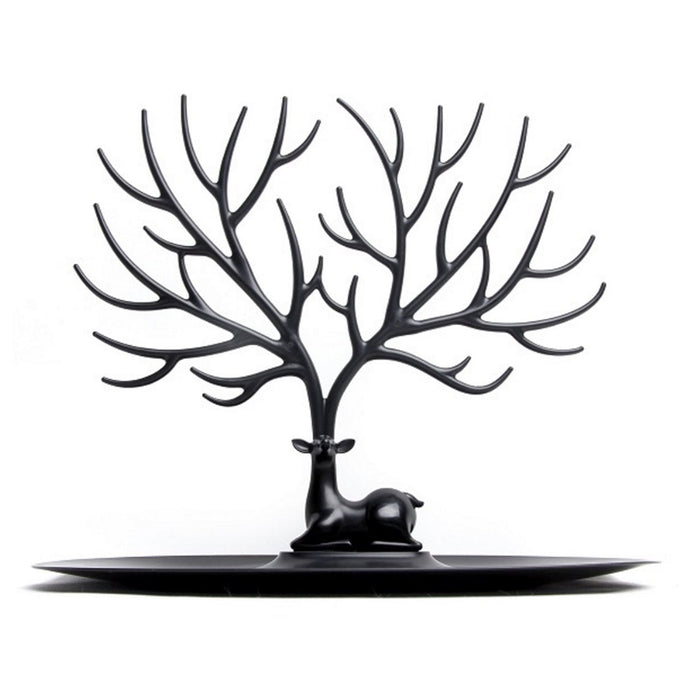 Make this beautiful deer design jewelry stand a centerpiece of your vanity or bathroom counter. The lovely design adds a touch of classic beauty to your space, while the deer's antlers form branches can provide you with a place to display, store, and organize your necklaces, bracelets, rings. You can also use the oval shaped tray at the bottom of this jewelry holder to store more rings, bracelets, necklaces, baubles, and other items.