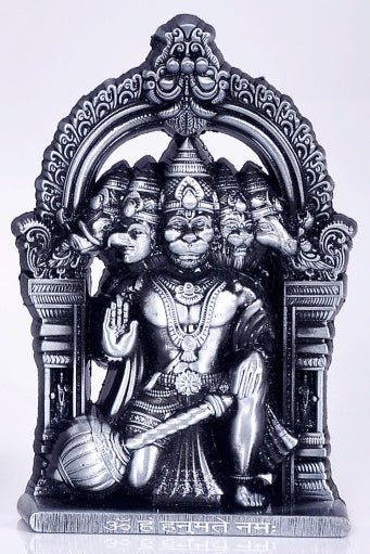 Design: Five-faced (Panchmukhi) representation of Lord Hanuman with detailed arch and base; base carries a carved Sanskrit mantra/inscription.