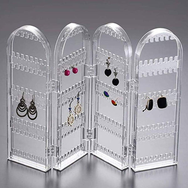 Acrylic Earrings Holder for Women, 4 Doors Foldable Screen Necklace Display Rack, Hanging Jewelry Organizer Double Sided Stand Display, Clear (1 Set)