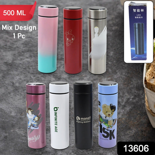 Printed Smart Vacuum Insulated Water Bottle with LED Temperature Display (1 Pc / 500 ML Approx / Multicolor / Mix Design)Description :- This LED ...
