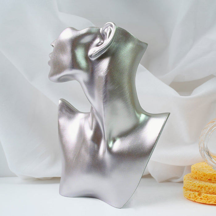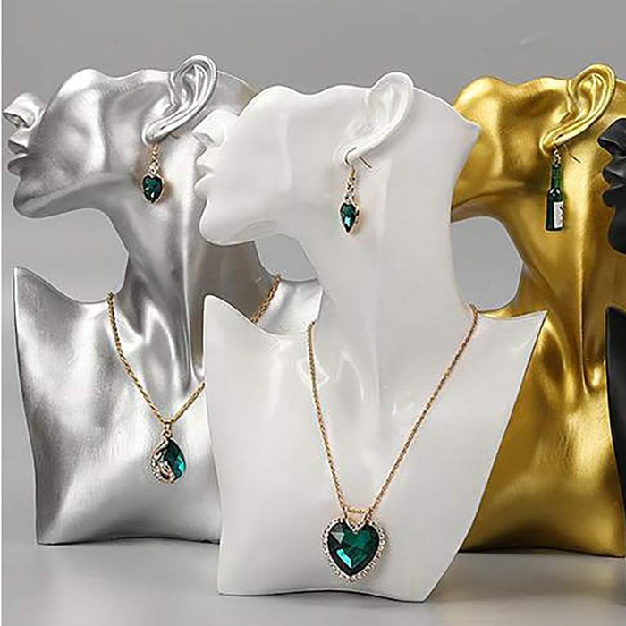 - Contemporary display that emulates the partial face, neck, and shoulders of a woman to highlight necklaces and earrings.